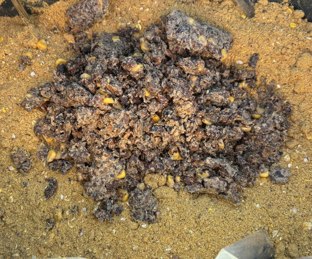 これを丸ごと入れて混ぜてしまうのですが、混ぜる前に刺し餌としてコーンやさなぎを取り出し、刺し餌として使用します。