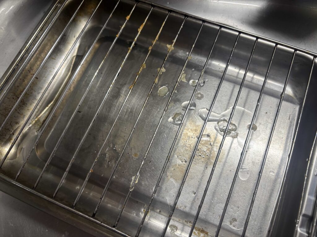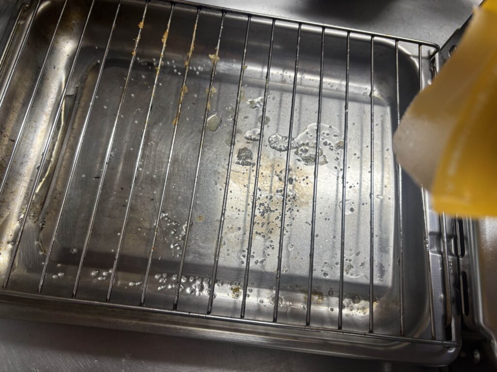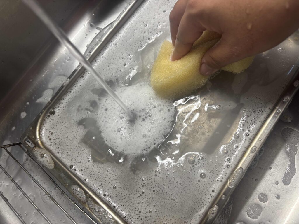 例えば、魚焼きグリルなどで魚の塩焼きをした場合、通常は食器洗い洗剤とスポンジなどでゴシゴシ洗うと思います。