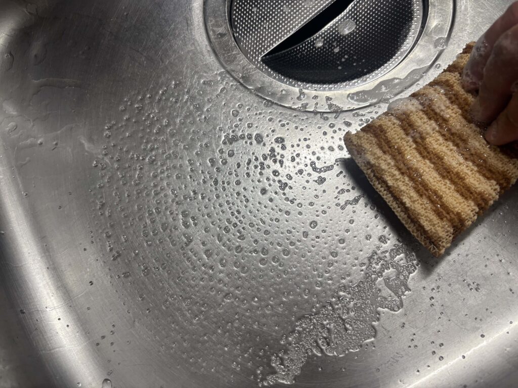 そして、シンク内をクエン酸の粉を巻き込むようにして、シンク用の清掃道具(僕の場合、とうもろこしスポンジ)で軽く擦り洗いすると、魚臭がいとも簡単に消えます。