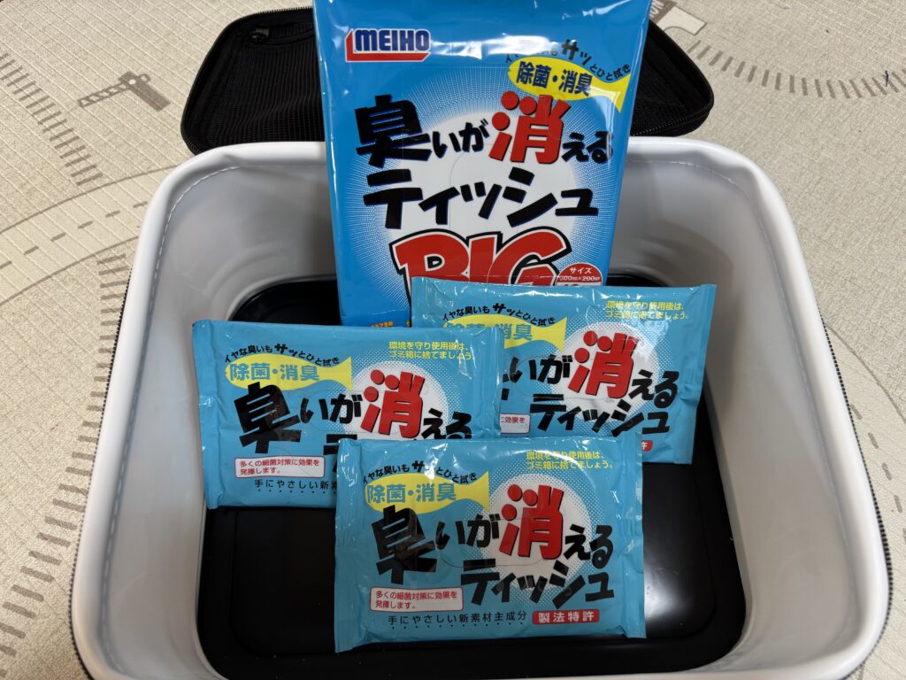 これまでスプレー式のオキアミ臭対策やその他色々なシート材を使ってみましたが、購入のしやすさや道具入れなどに、さっと道具入れやウェアに入れておける手軽さから「臭いが消えるティッシュ」に辿り着きました。