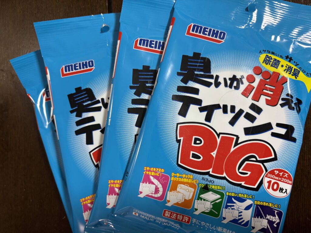 多くの釣具店で売っているので、釣具店にさえ行けば入手しやすいと思いますが、その中でも粘着式で売っているポケットテッシュサイズではなく、「ビッグサイズ」がおすすめです。