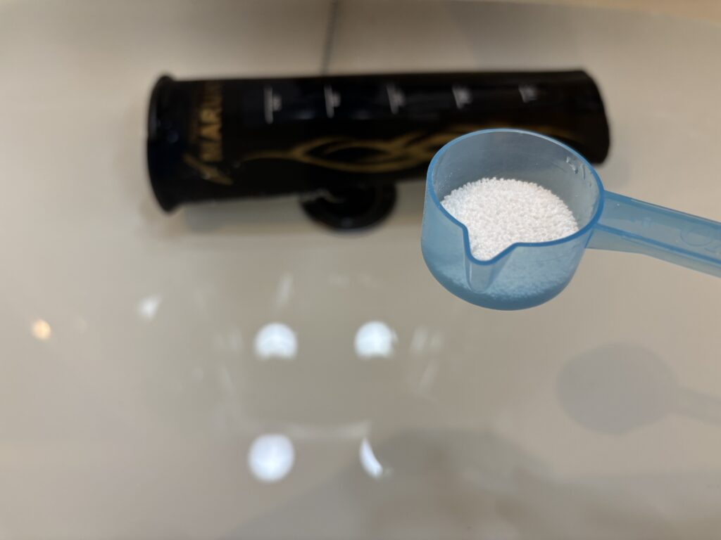 洗面台にお湯を貯める場合、オキシクリーンを10gほど入れます。