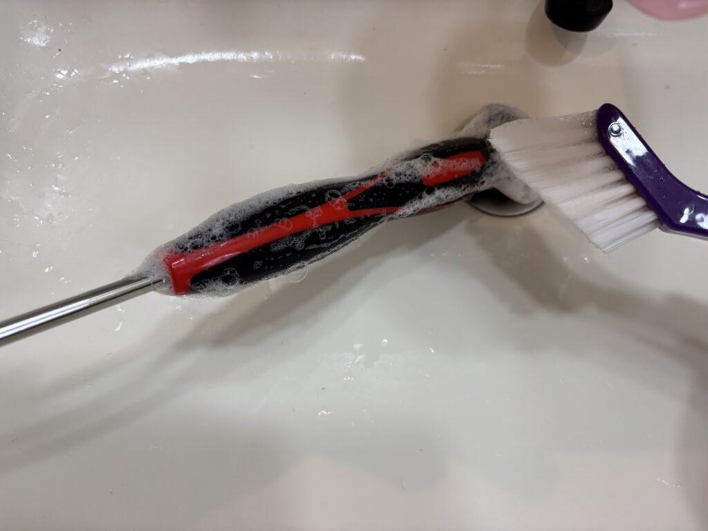 そのため、長く泡を馴染ませると汚れに直接浸透してくれる、しかも道具に優しいウタマロ洗剤がベストだと結論に至りました。