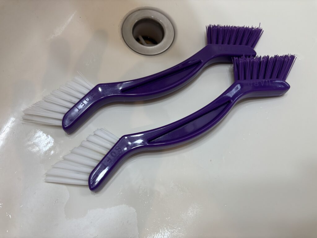 もっと柔らかいブラシもありますが、掃除全般で使用する上である程度のコシとハリのバランスが良いのが、墓石ブラシだったんです。(ダイソーの場合)