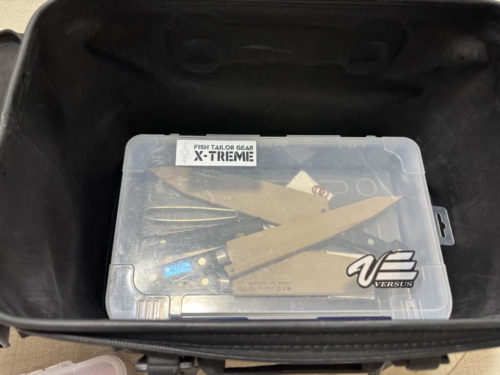 主に津本式究極の血抜きのアイテムばかりなのですが、これは僕は釣具の道具として考えているので、「VS-3043NDDM」の中に魚を捌く全ての包丁やケース、血抜きに使用する際のホースや小物類、手袋に至るまで全て入れています。
