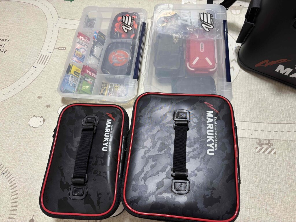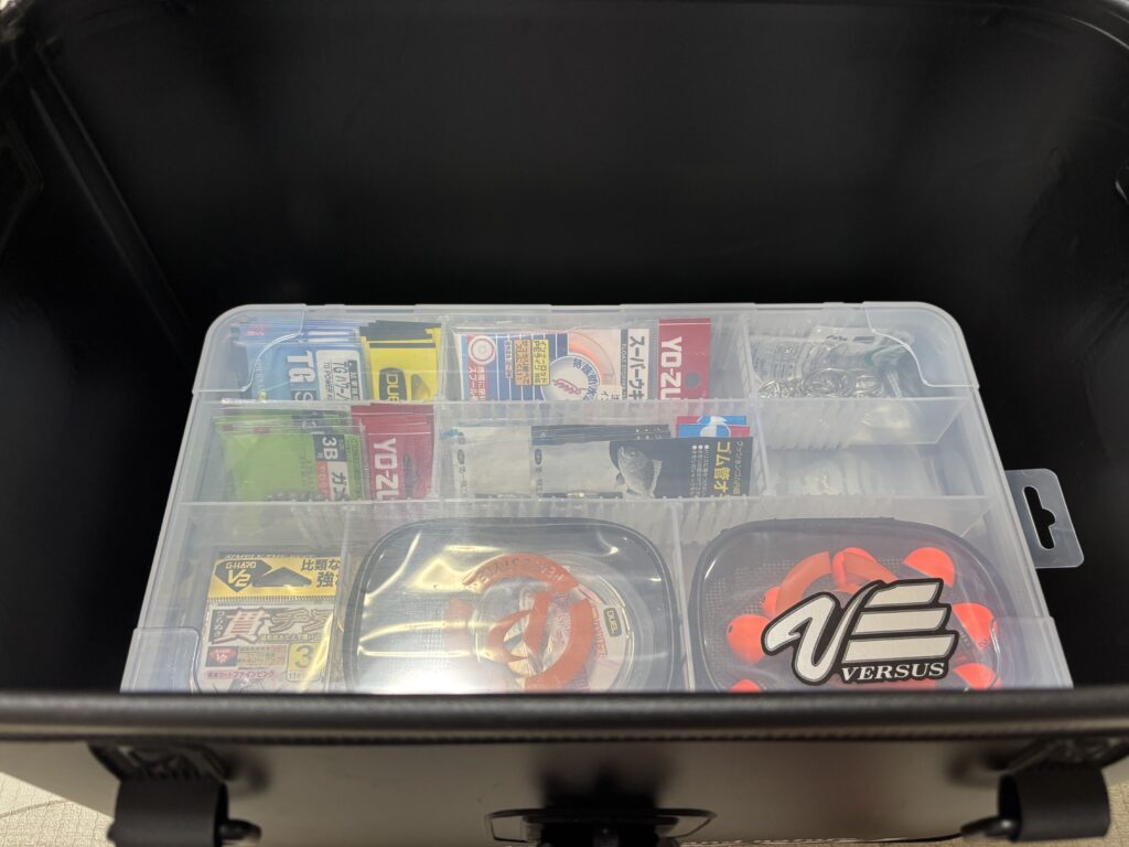 ロックフィッシュ用のワームを平置きで大量に入れていたり、ウキフカセ用の小物の予備をまとめておいたり、おかっぱりからのライトゲーム用の小さなケースをまとめていたりと色々使っています。